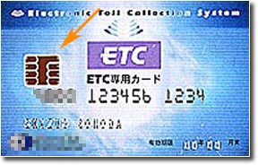 ETCを使用するにあたってETCカードというのを持たなければいけません。ETCカードにはカード内にICチップ(オレンジ色矢印部分)が埋め込まれていて搭載車のETC車載器に挿入していなければゲートを通過できない仕組みになっているからです。ICチップにはクレジットカードから料金を引き落とすための情報が入っています。(車の型番、登録番号等の情報は入っていません)